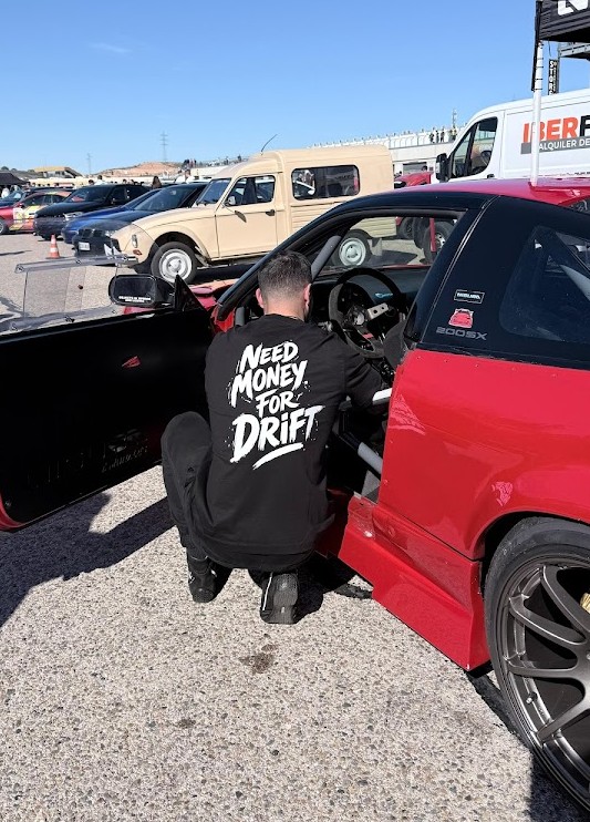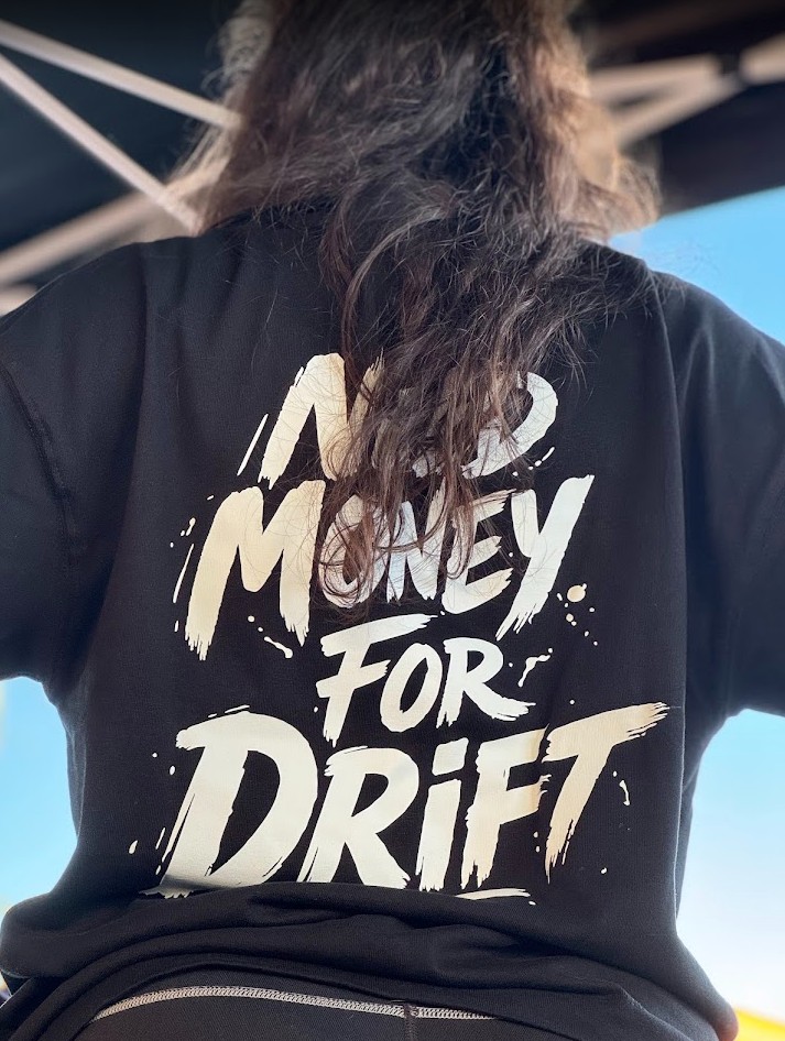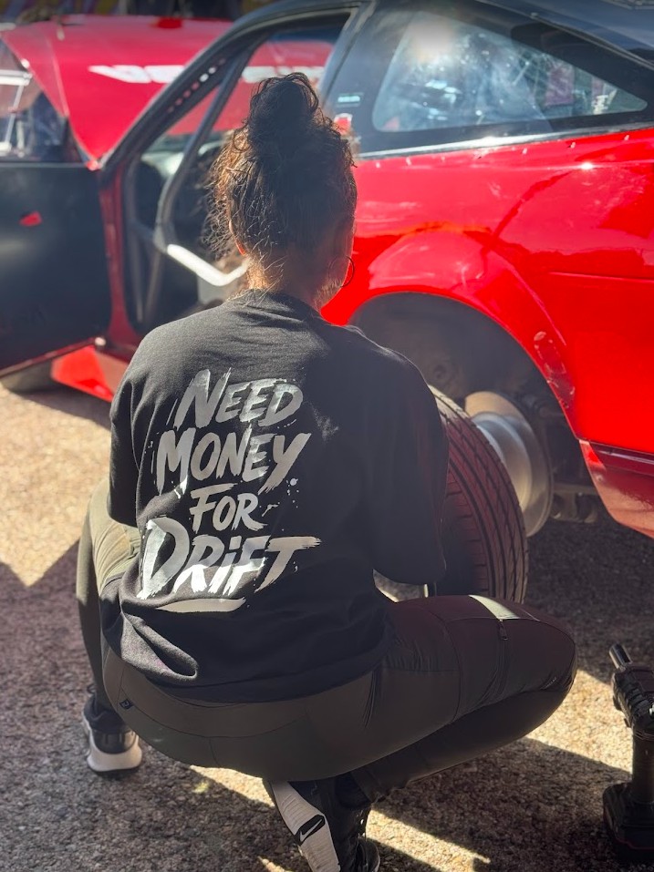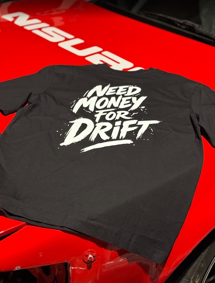 Camiseta de alta calidad con la frase NEED MONEY FOR DRIFT en la parte trasera y el logo de Nisuba centrado en la parte delantera.